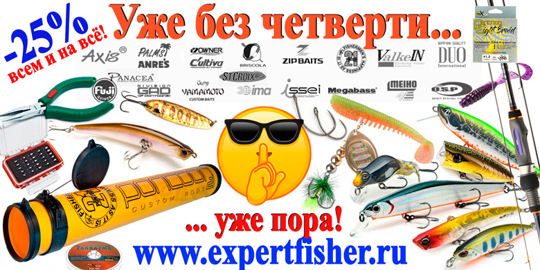 «Рыболов-Эксперт» упрощает всё – и всё, что есть на сайте www.expertfisher.ru вы можете заказать со скидкой 25%. А что там есть для вас? А то, что вы успеете положить в корзину, опередив других (снасти, как и «пятницы» имеют привычку однажды заканчиваться):