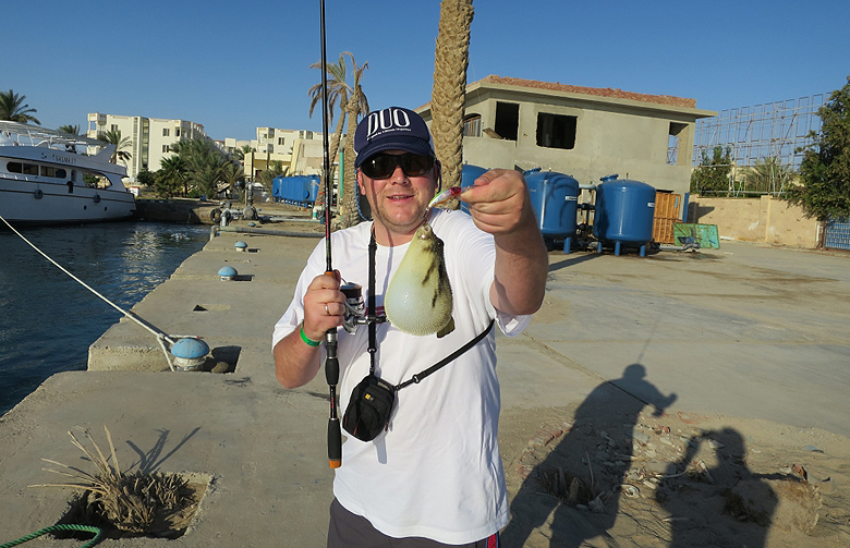 Рыбы нет, есть только вся та же мелочь под берегом, которая на раз-два безнаказанно убивает запасы моих приманок. Тут я решаю половить «на дурачка» – ставлю небольшой глубоководный воблер OSP Dunk 48 SP. У него хорошее заглубление и небольшой размер, который по идее должен быть интересен рыбкам самого разного размера. Равномерную проводку по площади марины чередую с рывковой. На одной из рывковых проводок чувствую, что что-то повисло. «Пакет» – подумал я. Ибо никакого сопротивления на вываживании повисшая неизвестность не оказывала. Но тут «пакет» показывается, и, о чудо! Это «кузовок»! Радость переполняет меня! Египтянин делает фото!