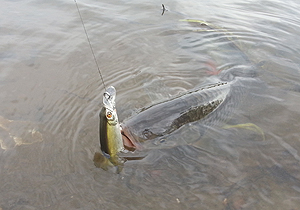 Было решено планомерно облавливать уже знакомые нам участки водоёма, перемещаясь от одного к другому, делая ставку на поиск активного хищника. Первая часть маршрута ничего интересного, кроме нескольких некрупных щучек, пойманных под берегом на воблер, не принесла. Зато дальше, когда выбрались на более глубокий участок, у моего тёзки Артёма с первой же проводки на выбросе что-то виснет. Напряжённое вываживание, рыба долго не показывается из воды… Мы теряемся в догадках, кто же это может быть? В такие минуты больше всего боишься, что рыба сойдет, а ты так и не узнаешь, кто это был. Но одна из догадок оказалась верной: я заметил, что уж очень часто рыба кувыркается вокруг себя - это было хорошо видно по леске, ходившей ходуном.