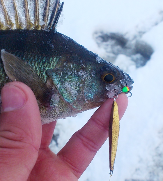 Интересно, что все ловили на очень разнообразные приманки. Кто-то на балансиры, кто-то на довольно крупные блёсны. Понятное дело, что лучше всех дела шли у мормышечников. Несмотря на то, что окунь клевал на разноплановые приманки, он оставался очень привередливым. Пока я не поставил вот такую, валявшуюся без дела года четыре, блёсенку (длина 40 мм, вес 3,7 г), у меня клевала в основном одна мелочь.