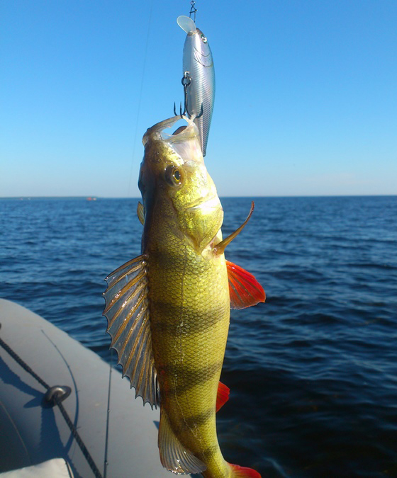 За половину дня я смог поймать только пяток небольших матросиков, которых и фотографировать не хотелось. Рыба никуда не делась. Окушки время от времени выбегали за вертушкой, но атаковать её явно не собирались. В одном примечательном месте я заметил, как за приманкой выбежала сразу небольшая стайка окушков. В попытках уже просто половить я поменял вертушку на воблер Pontoon21 Preference Minnow 75SP-SR, но это не изменило общей картины. Окуни вяло выбегали теперь уже за воблером. Нужны были более серьёзные перемены. Я поставил воблер Pontoon21 Bet-A-Shad и провел его равномерной проводкой. И эта перестановка сработала. Сразу появился неплохой окушок, который уверенно атаковал воблер и был пойман.