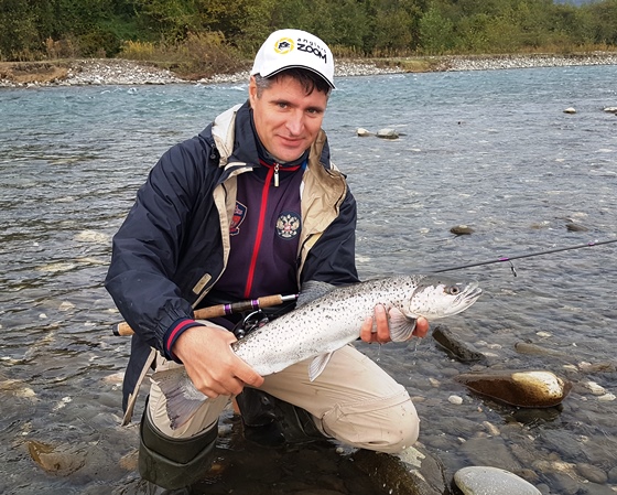 Следующий день мы как обычно провели на реке, проводя работу над ошибками. Мне хотелось половить в зоне «Б», где я не был, и посвятить время вертушкам и воблерам, с которыми у меня не сложилось на соревновании. С воблерами у меня опять ничего толком не получилось, хоть поклёвки и были, а на вертушки форель ловилась неплохо. Особенно ближе к обеду, когда вышло солнце и стало заметно теплее. За волю к победе речка мне выделила персональный приз – поимку черноморского лосося.