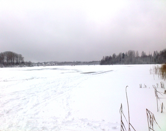 Четыре часа дороги и мы на месте. Теперь пару километров по сказочному лесу и вот оно – озеро. Народа довольно много. Если место пользуется популярностью у местных, то клевать должно хорошо. Говорят, что вчера поверхность льда в основном была ещё чистой. Сегодня весь лёд засыпан приличным количеством снега. Такие перемены никогда хорошо на клёв не сказываются. Но нам сравнивать не с чем, сезон надо открывать.