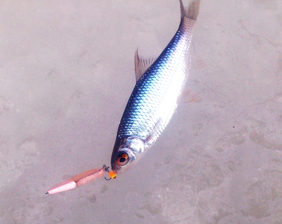Ловим вдвоём с Мишей Фёдоровым. Я хочу опробовать недавно сделанную торпедку. Для своей длины в 32 мм она имеет довольно большой вес – 2,9 г. На этом озере у меня часто по перволедью клевало на тяжёлые блесны. С первой же лунки на блесну вешается плотва уже при промере глубины.