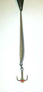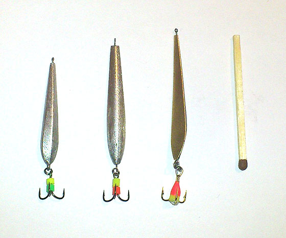 Через час поиска без единой поклевки я стал сомневаться в правильности выбранного решения. Все чаще вспоминал слова Сейнера, который вчера единственный из всех обежал вторую половину озера и вернулся оттуда с результатом всего в две нереализованные поклевки. Ну не может же быть такого, чтобы вся рыба собралась в одном месте? Наконец попадаю на раздачу. Лунка сразу приносит около 20 окуней. Неужели попал? Но нет. Вокруг клевало хуже. Три–пять штук, есть и пустые лунки. Главное нет темпа, очень долго приходится раскачивать. «Ладожская» блесна работать отказалась. Пока лучше всего получалось ловить на вот такую «торпедку».