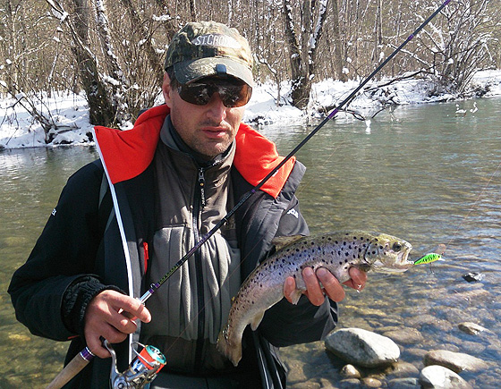 Этим обстоятельством мы с удовольствием воспользовались и отправились на рыбалку. Ловить пошли на тот же участок речки, где и тренировались. Форель за ночь так замерзла, что некоторые рыбины в буквальном смысле грели свои спины на солнышке на самом урезе воды. Пару штук выскочили практически из-под сапог и смешно метались между камней, пытаясь найти спасительную глубину. Но на глубине их тоже поджидала опасность уже в виде наших приманок. И избежали ее не все. Некоторым пришлось выдержать короткую фотосессию.