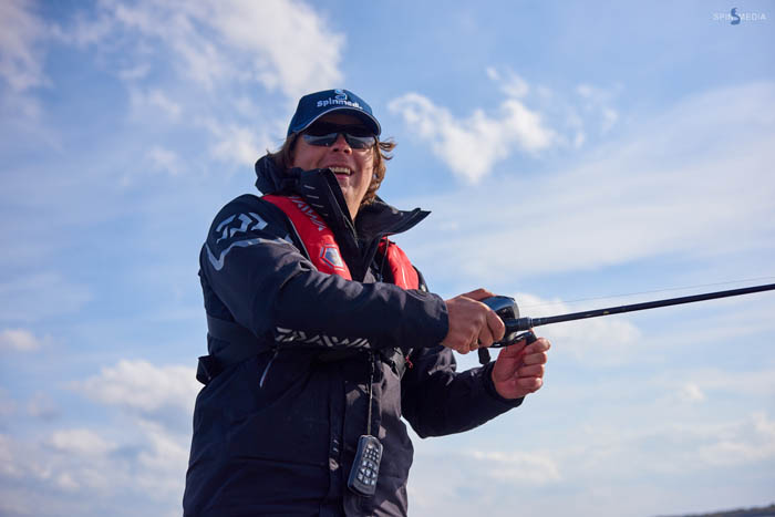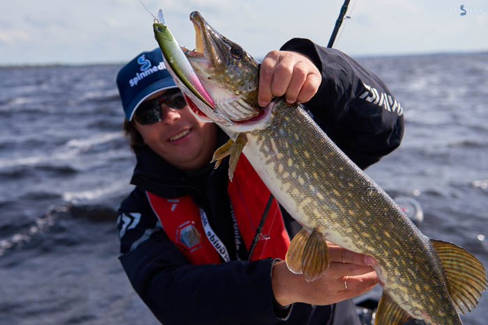 Решаем пойти и проверить несколько точек, наработанных нами во время неофициальной тренировки. Заходим в залив, здесь на дне по периметру простилается ковёр травы. Я ставлю вращающуюся блесну Synchrony от Pontoon21 и отправляю приманку в воду. Спустя некоторое время на одной из проводок у меня происходит поклёвка, подсекаю, есть! Недалеко от нас стоит лодка со спортсменами из другой страны, поэтому поднимать рыбу на борт и афишировать поимку не стали. Незаметно подвожу добычу к лодке и аккуратно отцепляю неплохого размера щучку. Следом происходит ещё одна поклёвка, на этот раз я просто не стал подсекать, и рыба не засеклась, уйдя незамеченной. Проверив не самое перспективное место, мы убедились, что все наши наработки верны, и мы движемся в правильном направлении.