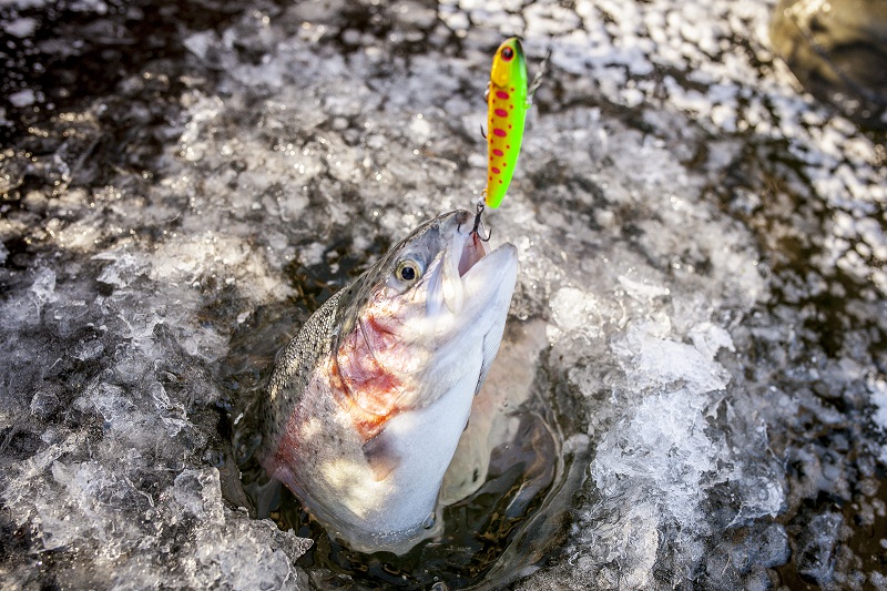 Ближе к полудню рыба на мои ратлины реагировать постепенно перестала. На следующий день по прогнозу должна была случиться метель, со значительным повышением температуры и падением давления. Перехожу на приманки, размерами поменьше. Вернее – переходим. Нас же было двое в тот день. Миша Калинин обеспечивал фотосъёмку процесса. И когда основная задача была выполнена, то и он решил блеснуть мастерством. И блеснул! С собой у него была коробочка с приманками для микроджига. И на огрызок белого твистера он вполне себе удачно ловит неплохих размеров форель.
