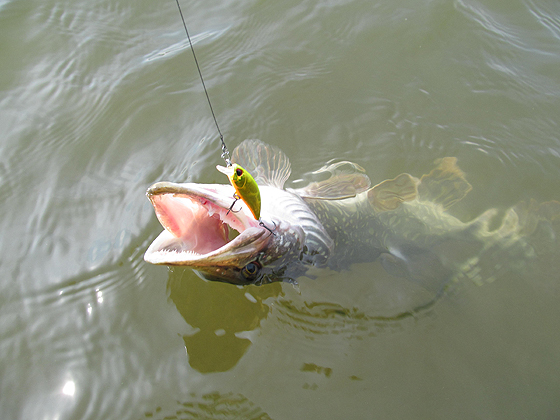После этого захотел поставить совсем небольшой воблерок, размером с местного малька, чтобы узнать, насколько интенсивными могут быть поклевки. С собой из маленьких приманок у меня были лишь некоторые форелевые воблеры, и я поставил DUO Toto 48S. Этот малыш с минимальным заглублением позволяет выполнить твичинг на очень высокой скорости – такой стиль ловли с подобными приманками выручал меня уже не раз, тем более по стайному окуню. Поклевки начались практически сразу, воблер отлично ловил в таких условиях, сработал и размер, поклевки стандартных окуней шли одна за другой. Более крупные окуни клевали среди кустов элодеи, приятной неожиданностью стало и то, что Toto часто проскакивал эту траву, особенно если сделать небольшую слабину, после чего продернуть воблер, и он освобождался, играл дальше и атаковался рыбой. В один из таких моментов произошла резкая хватка, сначала я подумал, что сел более крупный окунь, но через мгновение понял, что это щука. После нескольких свечек и осторожного вываживания, я аккуратно взял килограммовую хищницу, несмотря на то, что на приманке стояли небольшие крючки из тонкой и острой проволоки. Они пробили краешек губы на нижней челюсти и уверенно удержали рыбу.
