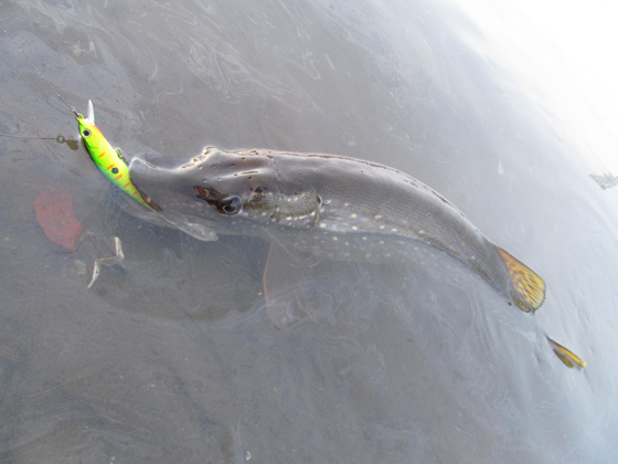 Дальше поклевок на эту приманку не было, видимо, надо было добавить еще свинцовых наклеек, чтобы она шла глубже, но этого делать не хотелось, поэтому я просто сменил приманку и поставил DUO Rozante 63SP. А вот с этим воблером я попал в «десяточку» – поклевки на нее происходили регулярно и стабильно, как при активной, так и медленной проводке с увеличенными паузами, особенно если я облавливал им новое место или даже то, которое сработало до этого и немного от меня отдохнуло. Самое интересное, что рыбы в этот день было больше на ближней бровке, и щуки стали попадаться неплохие, весом до 2 кг.