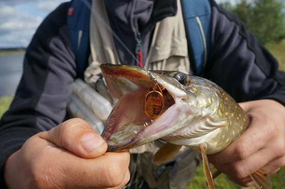 Так получилось, что первую свою рыбу, которую я поймал в одной из поездок, стала некрупная семга, весом около 2,5 кг, хотя Pontoon21 Ball Concept №1 я ставил для того, чтобы быстрее размочить счет поимкой первого хариуса или форельки. Довольно интересное совпадение, не зря нам запоминаются именно такие эпизоды. После этого стали попадаться небольшие форели, а вот голавля, я пока не поймал, не люблю ловить его вертушками. Хотя теперь, для полной картины, надо исправить этот недочет поимкой лобастого, ведь если вы присмотритесь к этим фотографиям, то увидите, что почти все рыбы, кроме одной из щук, были пойманы на один и тот же экземпляр блесны. Вот и еще один плюсик, только отличная уловистая блесна может стабильно приносить улов в самых разнообразных условиях, при ловле той или иной рыбы.