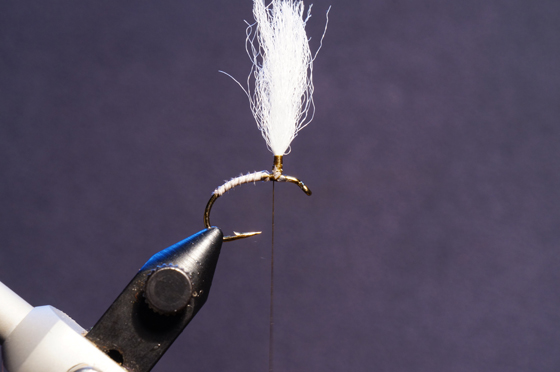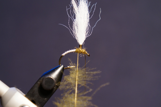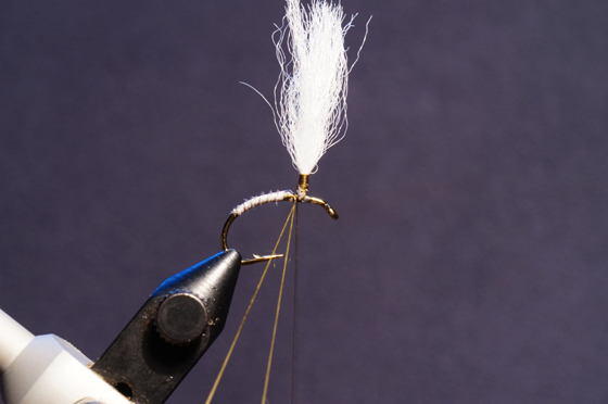Сделайте финальный узел и отрежьте излишки волокон Aero Dry Wing. Будьте аккуратны с нанесением лака на узел – старайтесь не попасть на бородки перьев CDC, иначе они склеятся.