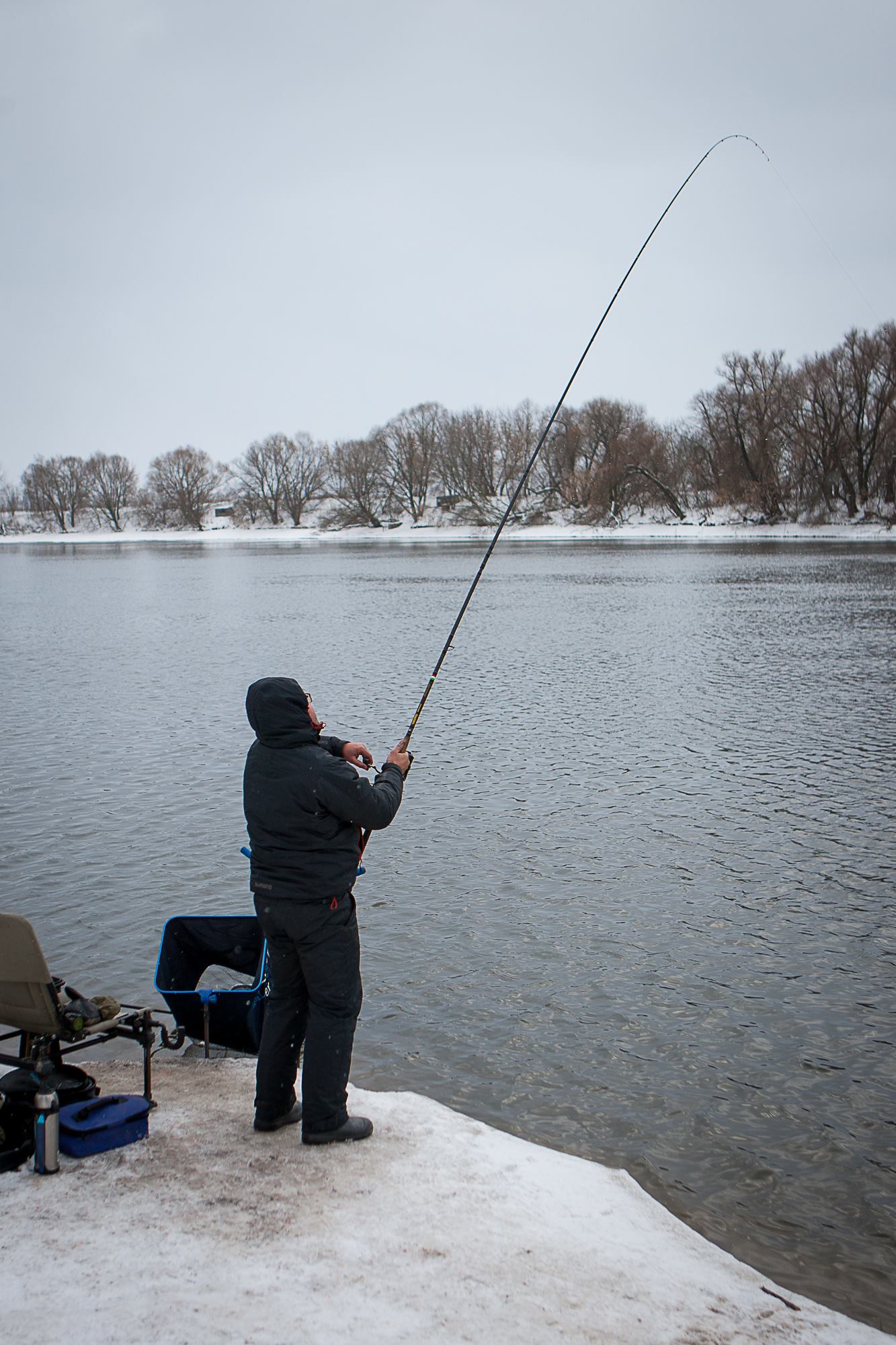 Товарищ, увидев мою снасть, понял, что я полезу в дальние дебри, он заранее предупредил меня о том, что там с рыбой не очень хорошо, есть интересное место на 50 м+, но присутствует злая бровка и много ила на дне. Он сказал, что вся нормальная рыба под ногами, на 28-30 м и, чтобы не валял дурака, садился и ловил впереди. Я, как всегда, люблю плыть против течения, поэтому, если все нормальные ловят у ног, я, почему-то, должен лезть на рожон. Я пообещал моему коллеге, что денёк я половлю в дали, а вот в следующий раз обязательно буду удить там, где он скажет. В конце концов, я верил, что зимой ближе к фарватеру плавают одинокие толстопузые лещики, мне нужна была одна, но большая рыбка. Дальнейшие мои действия были связаны с поиском точки под водой, делать я это стал своим рабочим фидером с маркерным грузом в весе 80 г. Кстати, до фарватера этой снастью я с лёгкостью докинул, но ничего интересного там не нашёл: сплошной ил и мусор на дне, а вот ближе на дистанции 54 м нащупал жёсткую бровку, преодолеть которую сразу не смог – груз, зараза, залип. Если бы не длинное удилище да и леска с хорошей разрывной нагрузкой, пришлось бы оторвать, но всё обошлось. Ловить сразу за бровкой – не вариант, пришлось отступать дальше на три метра. Место это было классическим лещовым, по крайней мере, если бы я был лещом, плавал там точно.