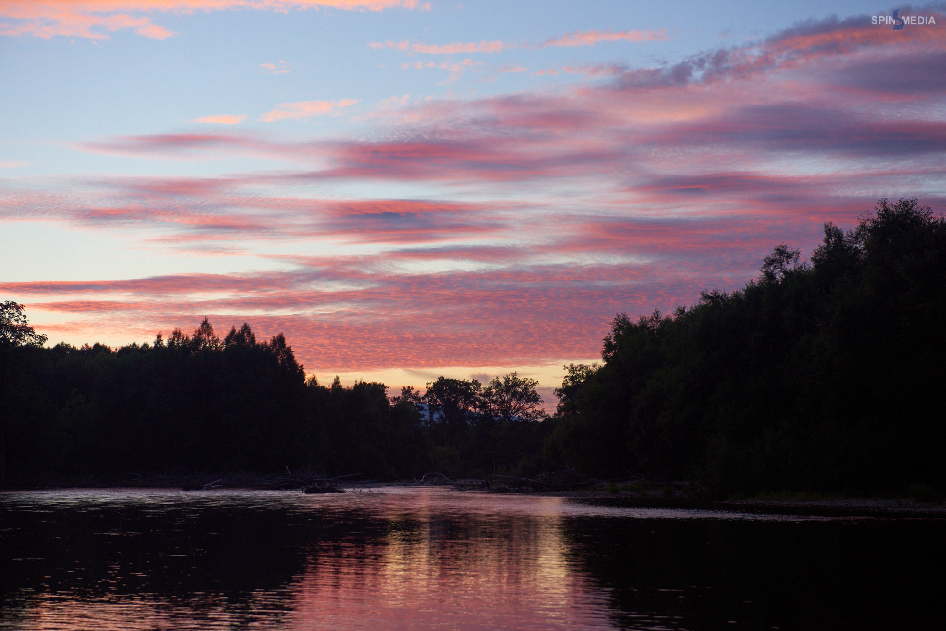 Вадим с Денисом, имея негативный опыт порчи аппаратуры во влажных условиях, предусмотрительно запасшиеся герметичными сумками, прячут камеры. В этот вечер меня посетило нечто вроде ностальгического ощущения: год назад примерно в этих же местах мы видели такой же туман и ощущали похожие таёжные запахи, вслушиваясь в шум реки. Это непередаваемое ощущение, которое можно лишь испытать, оказавшись только там.