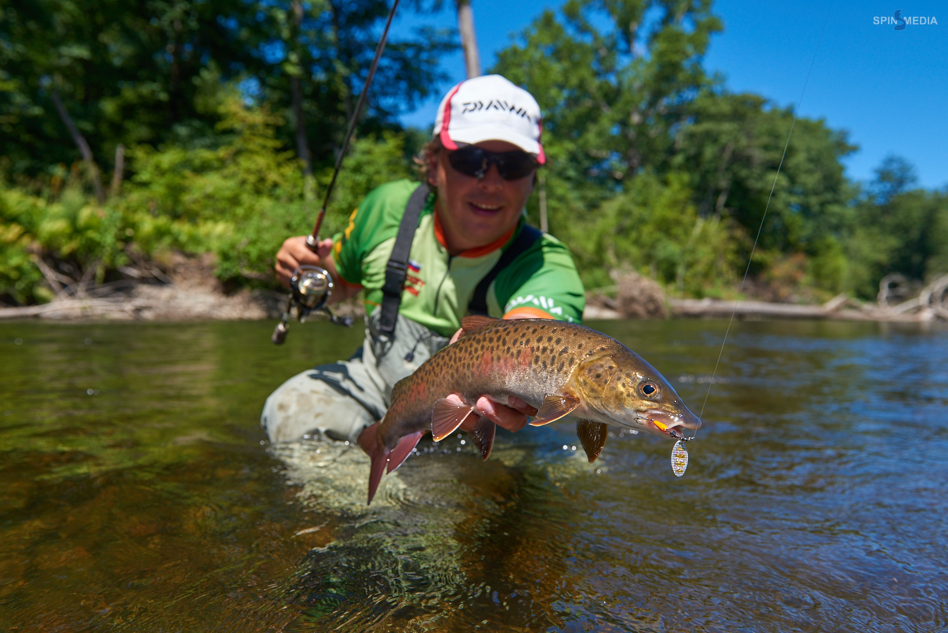 В процессе ловли прослеживалась явная тенденция на усиление активности: перемещаясь по протоке от места к месту, поклёвки становились более частыми и мощными. Сегодня я взял с собой ультралайт — Megabass Shoreluck SLL68ULT, оснащённый моей любимой форелевой катушкой Daiwa Exist’15 2003F-H с монолеской Daiwa Presso Durabra 4Lb. Этот комплект, которым я обычно ловлю ручьевую и голавля на речках у себя в крае, идеален для качественной ловли мелкими вертушками. Использовал я блёсны серии Trait от Pontoon21 в самых мелких размерах: #0 и #00.