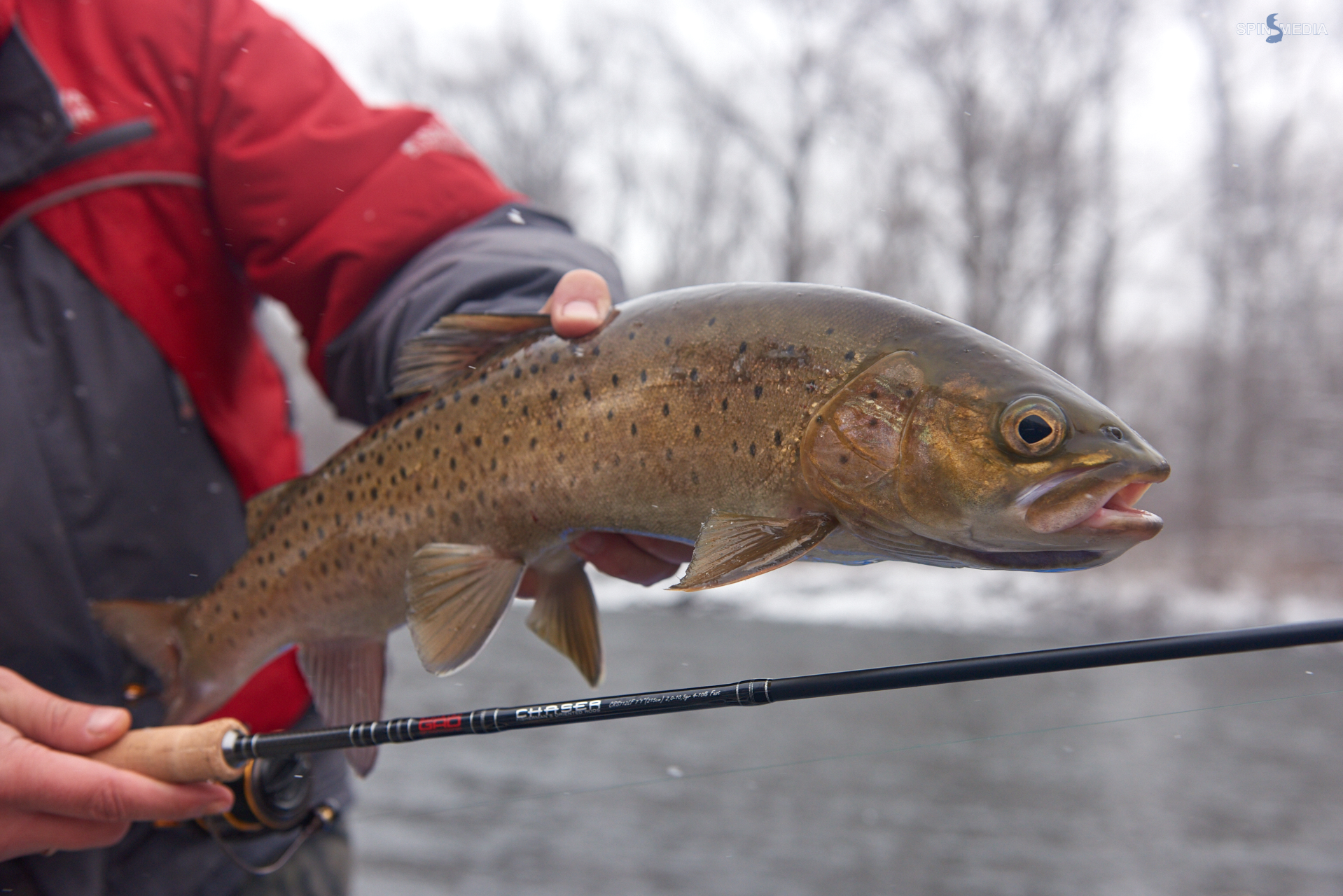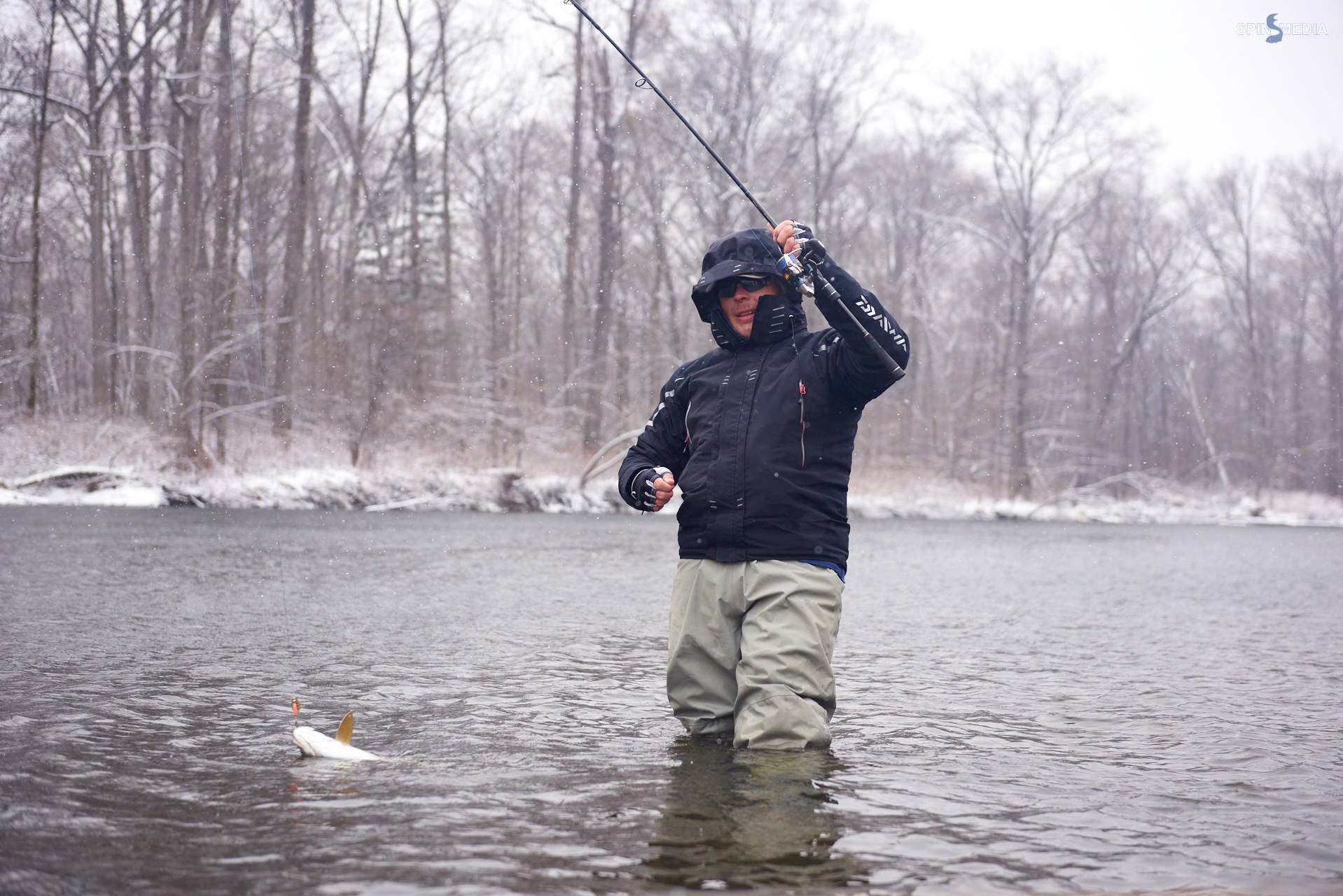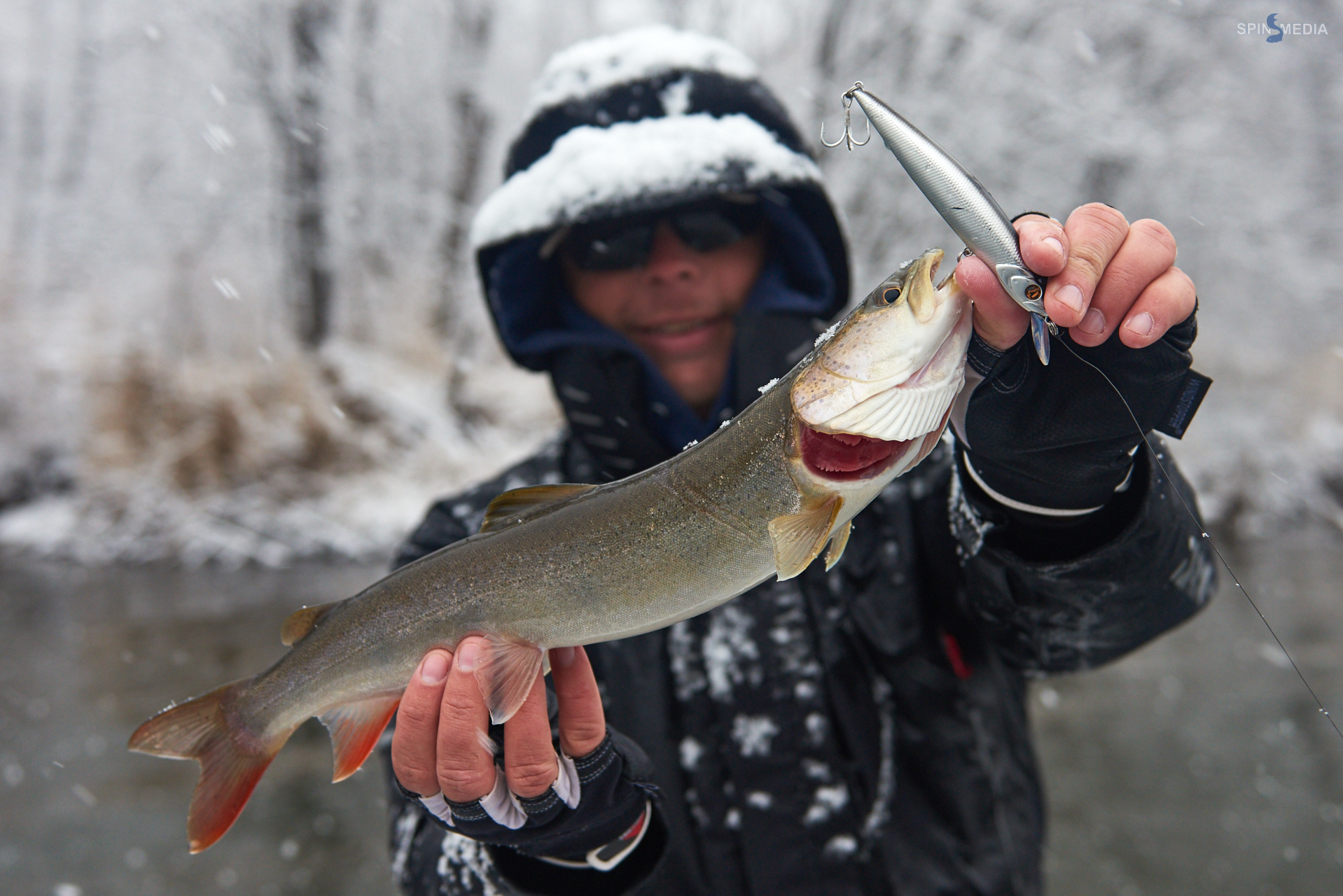Летом самой эффективной приманкой в моём арсенале оказался крупный воблер минноу Pontoon21 Cablista 125SP. Он устойчив на сильном течении, обладает активной собственной игрой и отличным рисунком игры при твичинге. Тогда я сделал выводы о том, какой типаж воблеров будет наиболее эффективен при такой ловле и к этой поездке подготовил более подходящий комплект приманок. Конечно, не забыл и о Cablista 125SP, взяв эту модель с приличным запасом по количеству. К полудню выходим на реку и отправляемся вверх на 12-14 км. Этого расстояния нам хватит, чтобы пройти его сплавом до конца короткого осеннего дня. Конечно, здешняя погода нам совсем непривычна, учитывая, что сейчас конец октября: минусовая температура, на берегах и косах снег, который, то и дело, подхватывают вихри очень сильного ветра.