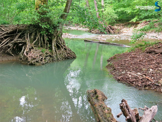 Здесь есть и подмытые корни, и навал бревен с корягами! Идеальное место, здесь точно живет он – глава местной голавлевой диаспоры. В предвкушении у нас обоих даже слюнки потекли. Делаем по забросу и я тут же ловлю что-то некрупное. Попался афипский голавль, но крупнее среднего размера для этого вида рыбы.