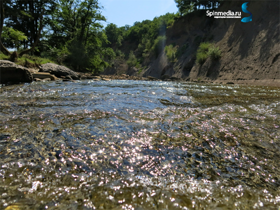 На речку мы прибыли после полудня. Воды относительно много: течет ручей нормального размера, обычно в конце июля эта речка представляет собой каскад приямков и заводей, между которыми вода просачивается под грунтом, а открытого потока нет вовсе. Частые обильные осадки в предгорных районах питают лесную почву влагой, потому уровень воды выше обычного летнего, а сама вода очень прозрачна, несмотря на ее температуру в +26 градусов!