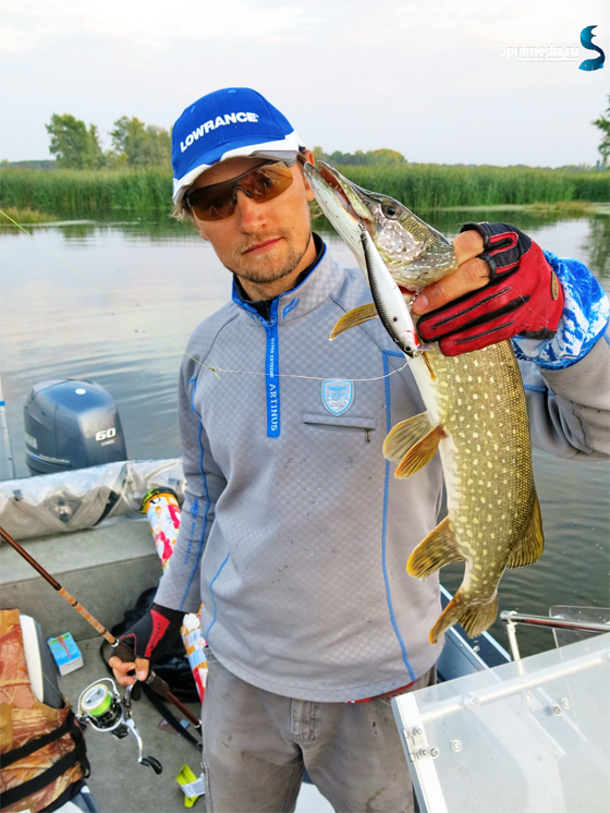Сергей поставил мелководный воблер минноу и с одного из первых забросов поймал из прогала щучку.