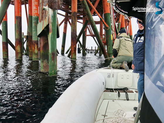 За молами море было не спокойно, но терпимо, решаем идти ловить. Но пройдя первые десять километров, я понял, что решение ошибочное. Вдали от берега волна выше, острее, а сила ветра заметно больше. Путь до ближайшей буровой платформы занял около часа, но на ней велась разгрузка катера технических служб, поэтому мы пошли к следующей платформе.