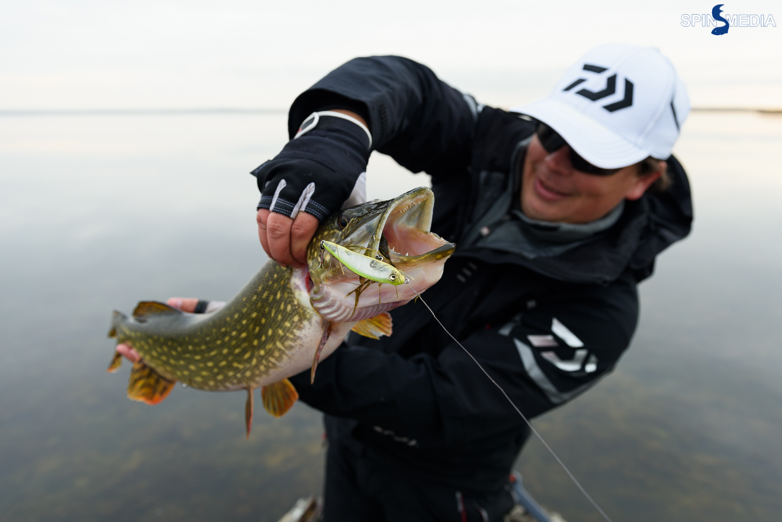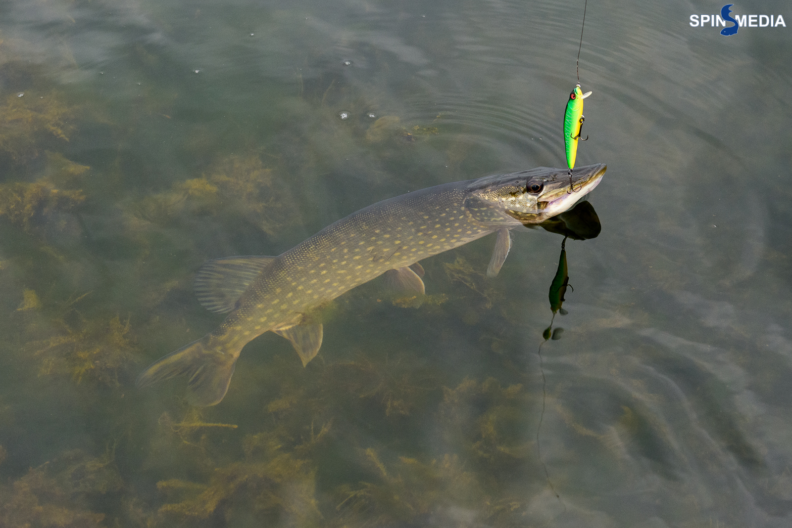 Встаем у края одного из прогалов. Алексей еще на базе поставил на легкий спиннинг воблер Pontoon21 Bet-A-Shad 63SP, поэтому пока я пересматривал содержимое коробки, как модница, которой «нечего надеть», он успел сделать заброс под дальний край прогала и, на первой же проводке, его воблер схватила щука!