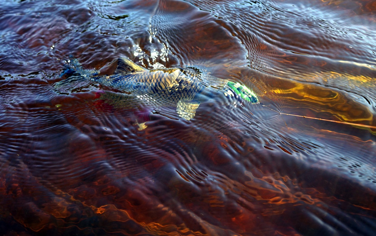 Первая же проводка напомнила мне, что я ловлю не щуку. И не джигом. По привычке я держал удилище в слегка разжатой ладони. Удар был такой силы, что Sixentida едва не вылетела из руки. Но мимо. Red Rag от Pontoon21, как всегда, оказался хорошим индикатором наличия. Ещё пара проводок – опять удар! И опять мимо. Автоматически переставляю приманку (Pontoon21 Preference Crank), на которую поймал здесь своего самого большого голавля (около 2 кг), и на следующей проводке упругие удары уже сгибали бланк удилища. Неплохой голавлик. Около семисот граммов. Тут же достаю коробку, и следующая приманка летит по ветру. Никак не могу избавиться от привычки «поймал рыбу – переставляй приманку». «В Ипполите Матвеевиче продолжал бушевать делопроизводитель загса» /с/. Наверное, зря. В итоге часа полтора, перебирая всевозможные крэнки от DUO, IMA, Megabass, OSP… не ощутил ни одного знака внимания от местной ихтиофауны. Хотя нет, на DUO Incubator Drop75 польстились пара окуней и неведомый малёк (похоже, жерешок). А Юра уже вытаскивает пятого или шестого голавля, причём под(за)килушного размера.