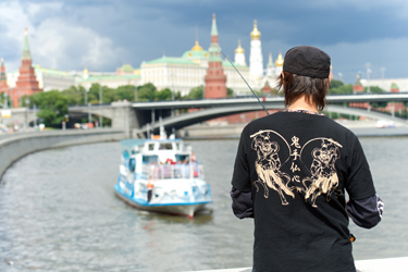 Другое дело, что выбранный день оказался не просто воскресеньем, а именно вторым воскресеньем июля, которое у нас отмечается как День Рыбака. Все сразу заговорили о неслучайном совпадении и руке провидения… И правда… Провидение позаботилось ещё и о погоде, подходящей для наших съёмок в первый день визита – 11 июля! При похолодании и дождях в Москве, именно в субботу, 11 июля, распогодилось. Небо поражало красивейшими сочетаниями разноцветных облаков, подсвеченных солнцем, оттеняя прекрасные виды Москвы, Кремля и, конечно, набережной, где Юки-сан наконец встретился со своим заочным знакомым – известным российским рыболовом, блогером и по совместительству пропагандистом «городской рыбалки» (streetfishing) Александром Рыжовым.